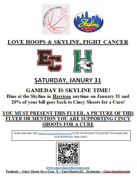 Find your way to (or pickup from) the Skyline in Harrison (10429 Harrison Avenue) anytime on gamday (1/31), show the flyer or a picture of it or mention Cincy Shoots for a Cure and 20% of your bill will be donated back to the cause!